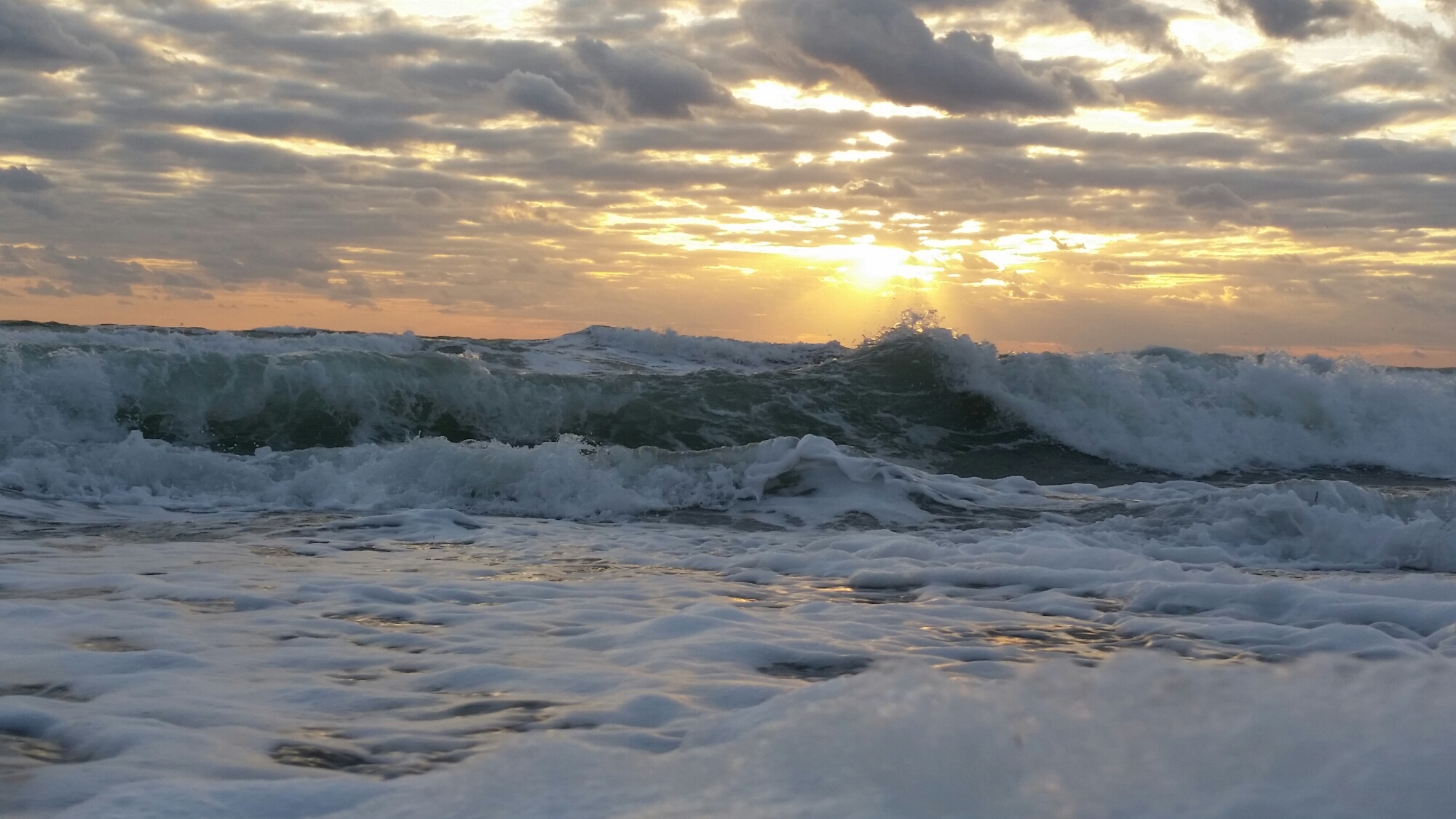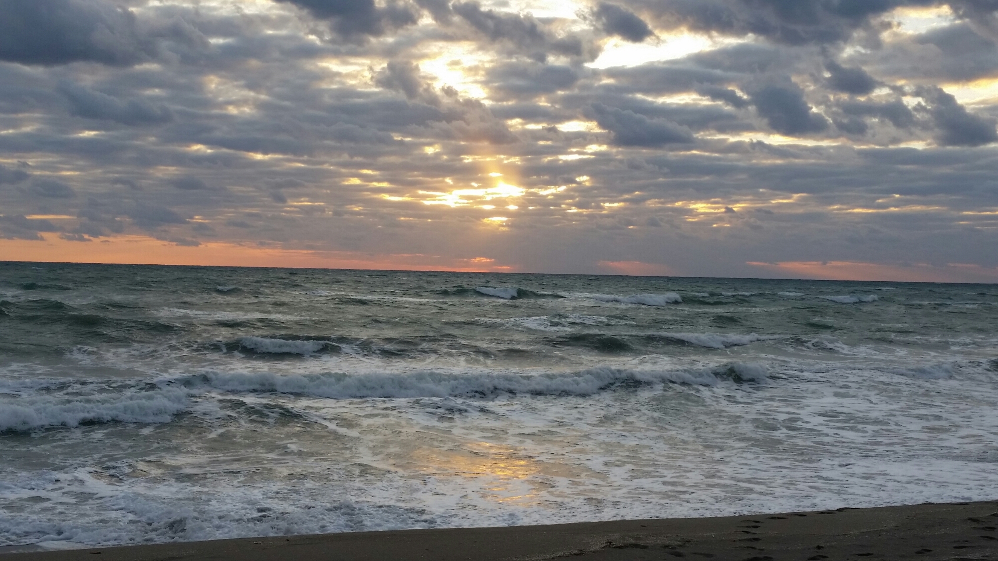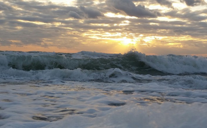 I decided to stop by the beach for a few minutes on my way to work for a little spiritual energy boost. I’m so glad that I did. I could hear the crashing surf as soon as I parked the car. I wanted to hurry before the magical colors of dawn drained from the morning sky. I ran barefooted like a crazy person across the shell parking lot and up the wooden steps that cross the dunes. I stopped in my tracks as soon as passed the mangroves. The scene before me was spectacular! Pounding waves beneath sunrise painted clouds as gulls rode the wild wind like kites. I ran down the steps to the uninhibited beach with my hair whipping around my face like a spastic Medusa. I pulled up the top of my trusty hoodie to tame my loony locks and enjoyed the exhilaration that the elements ignited in my soul. I only stayed about 10 minutes with my feet in the surf. The foamy sand and shells tickling my other soles as each wave receded back into the Atlantic. I absorbed as much energy as I could before crossing back to the parking lot and putting my still sandy feet into my socks and Dr Scholls work shoes and booked it to work. I could feel tiny bits of the beach between my toes all day at work and that kept a smile in my heart. After work the sunset was spectacular for my drive back home. 🙂